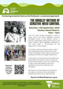 « All Events This event has passed. The Bradley Method of Sensitive Weed Control 13 September @ 10:00 am - 12:00 pm Free « Blairgowrie Friends of MPNP – Rosebud Secondary College Educational and Working Bee Sheepwash Creek Landcare working bee » Add to calendar Google Calendar iCalendar Outlook 365 Outlook Live Details Date: 13 September Time: 10:00 am - 12:00 pm Cost: Free Website: https://www.eventbrite.com.au/e/1336183373439?aff=oddtdtcreator Organiser Mornington Peninsula Landcare Network Email facilitator@mplandcare.org.au View Organiser Website Venue Wooley’s Beach Reserve 97 The Esplanade Crib Point, + Google Map